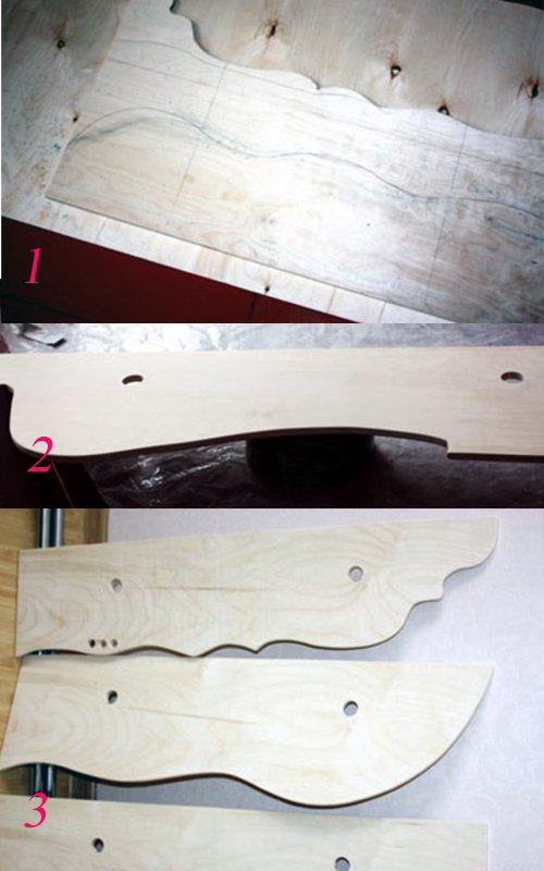 2. Согласно замерам рисуем на листе фанеры будущие полки. При этом конфигурация их может быть как самой простой (прямоугольные полки с закругленными углами), так и со всевозможными волнами, количество и глубина которых зависит от вас самих.