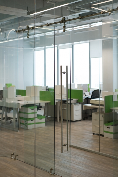 Раздвижные стеклянные двери способны отъезжать в сторону, а каретки, к которым прикреплено дверное полотно, - двигаться по верхнему рельсу. Эта конструкция предназначена для ситуаций, когда при открытии обычная дверь перегораживает проход или занимает много места. Откатные стеклянные двери ставятся внутри помещения.